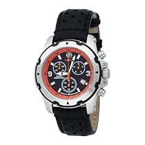 Sport watch Quartz movement Indiglo® night-light Chronograph featuring 30-minute 1/10-second and continuous seconds subdials Polished silver-tone sword hands with luminous accents and orange chronograph sweep seconds Orange hands mark subdials Applied luminescent Arabic numbers with polished silver-tone detailing at three and nine o'clock Applied luminescent baton markers with polished silver-tone detailing White Arabic numbers and black/white indices mark subdials Black Arabic numbers and indices mark surrounding minute track Analog date aperture at four o'clock Black dial with track-style texture and polished silver-tone logo applique Black genuine leather strap with perforated detailing contrast stitching and brushed silver-tone stainless steel buckle Brushed silver-tone stainless steel bezel with engraved triangle markers and black detailing Shock resistant brushed silver-tone stainless steel round case Textured steel crown with logo Brushed steel selector buttons Stainless steel caseback 100 meters/330 feet water resistant