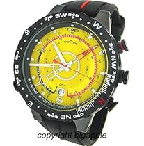 E Instruments - Camping watch Quartz movement Indiglo® night-light Multifunction featuring Digital compass with analog display Digital thermometer (measures air and water temperature) Tide-tracking sensor (counts high to low tide) Polished silver-tone hands with luminous accents and red sweep seconds Red fourth indicator hand Applied polished silver-tone square markers Luminescent dot hour markers Black Arabic numbers and indices Black Arabic numbers and white indices mark tempurature scale Analog date aperture at six o'clock Yellow dial Black silicone strap with brushed black stainless steel buckle Brushed black stainless steel turning compass ring with engraved white print/Arabic numbers Brushed black stainless steel round case Black steel selector buttons Stainless steel caseback Mineral crystal 100 meters/330 feet water resistant